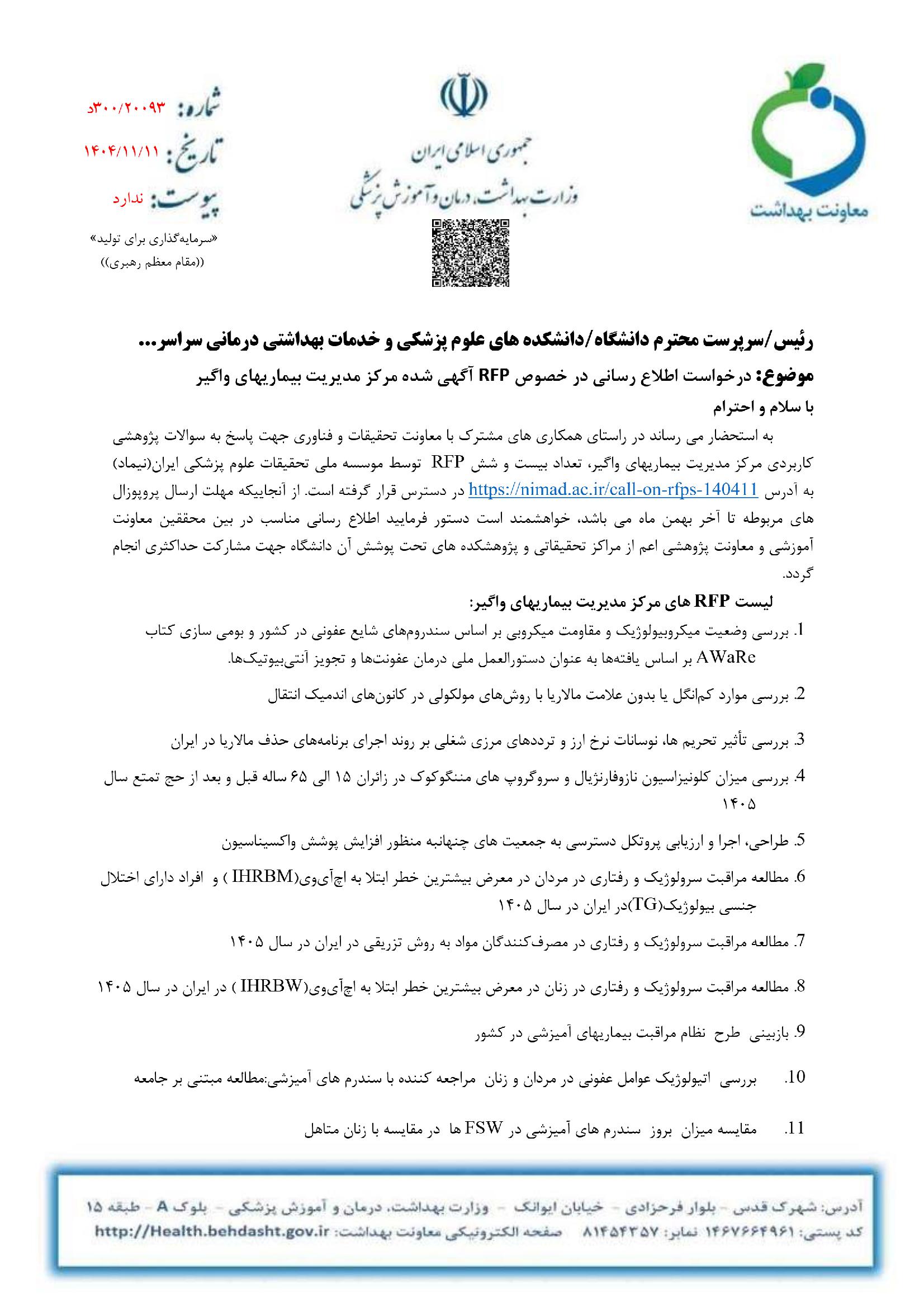 اطلاع رسانی در خصوص RFP آگهی شده مرکز مدیریت بیماریهای واگیر