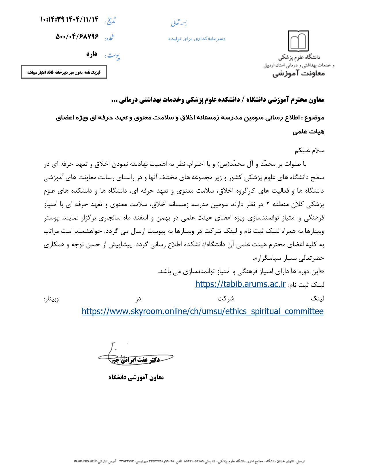 اطلاع رسانی سومین مدرسه زمستانه اخلاق و سلامت معنوی و تعهد حرفه ای ویژه اعضای هیئت علمی