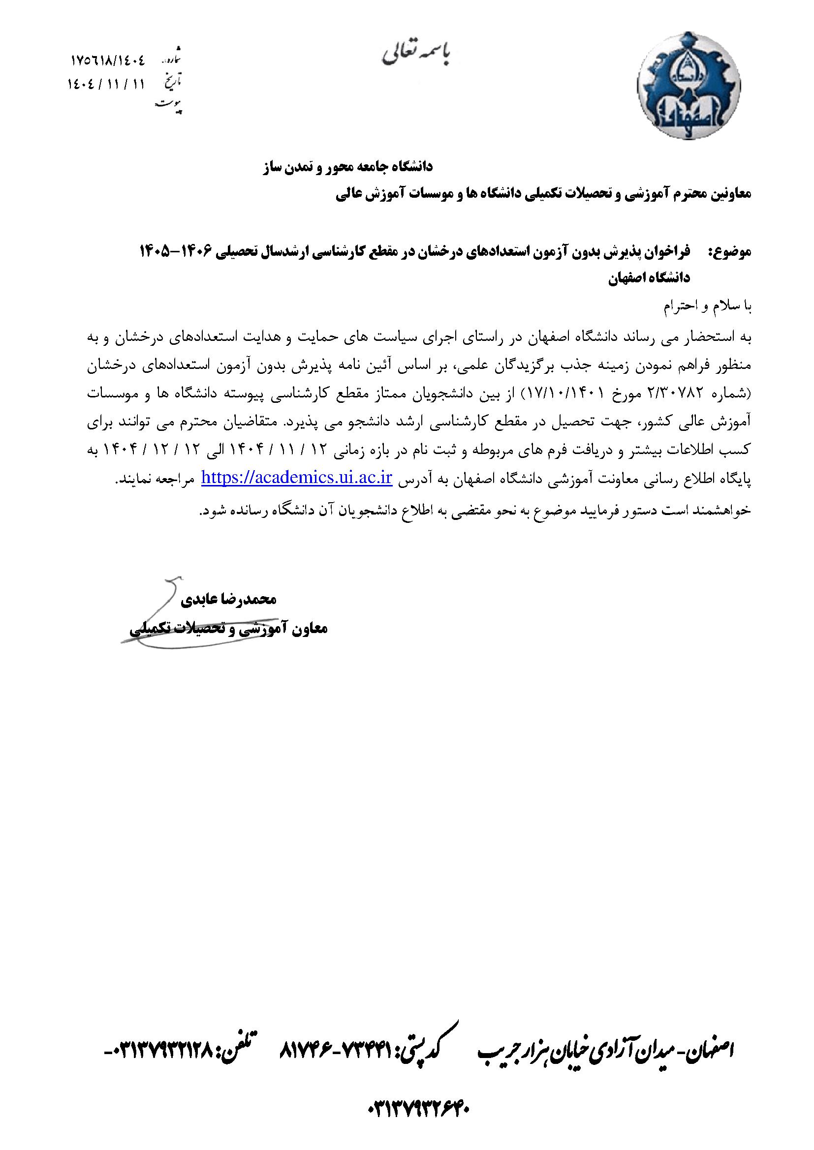 فراخوان پذیرش بدون آزمون استعدادهای درخشان در مقطع کارشناسی ارشد در نیمسال تحصیلی 1406-1405 اصفهان
